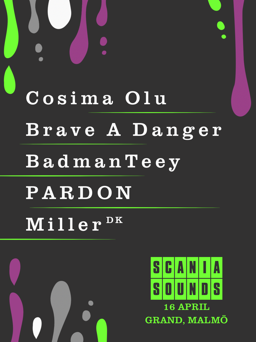 Scania Sounds är Öresunds showcasefestival med fokus att visa upp den bästa musiken just nu från Skåne, Danmark and beyond. Scania Sounds ger artister möjligheten att ta nästa steg i sin karriär genom att få visa upp sig för en publik bestående av experter och nyckelpersoner inom musikbranschen – men är också ett perfekt tillfälle för den musikintresserade allmänheten att upptäcka nya favoriter!