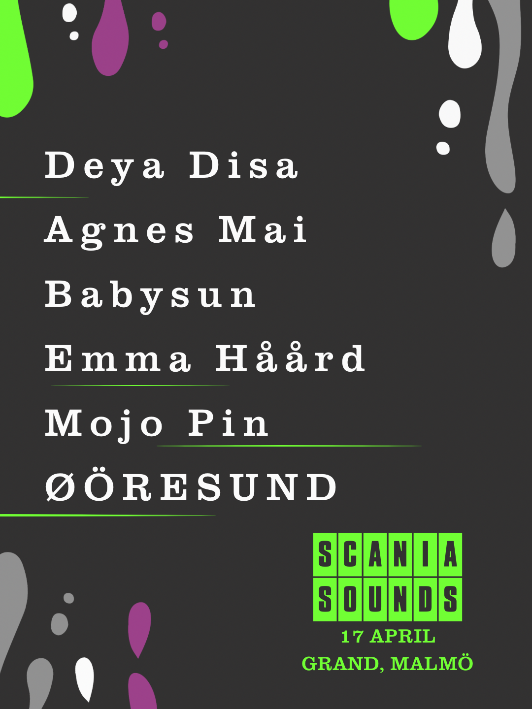 Scania Sounds är Öresunds showcasefestival med fokus att visa upp den bästa musiken just nu från Skåne, Danmark and beyond. Scania Sounds ger artister möjligheten att ta nästa steg i sin karriär genom att få visa upp sig för en publik bestående av experter och nyckelpersoner inom musikbranschen – men är också ett perfekt tillfälle för den musikintresserade allmänheten att upptäcka nya favoriter!